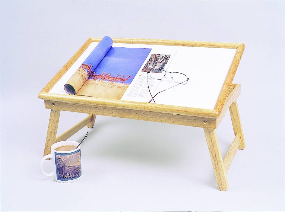 Deze bedleestafel is voorzien van een houten werkblad die in verschillende posities kan worden gesteld. Het frame is gemaakt van chroom en gecoat staal.